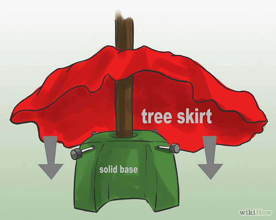 Кроме того, будет совсем не лишним дополнительно укрепить дерево, привязав его за ствол к какому-нибудь прочному устойчивому предмету с помощью эластичного шнура или верёвки. Обязательно накройте основание ёлки «юбкой» из ткани — это не только выглядит красиво, но и закрывает все крепления и электрические провода.