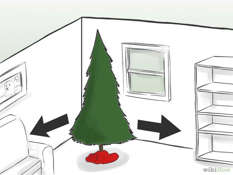 Устанавливать елку лучше поближе к стене, это дополнительная опора, и подальше от полок, столов и диванов, с которых легко запрыгнуть на дерево.
