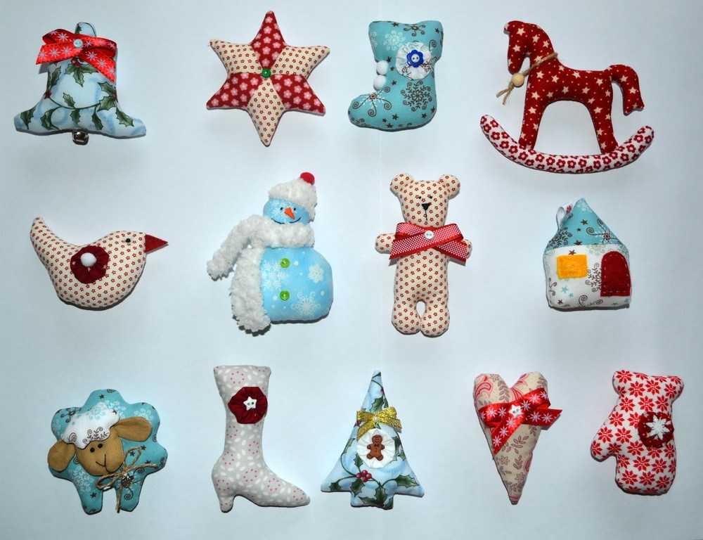Тряпичные игрушки, сшитые из яркой или белой ткани, однотонные или со снежинками, в горох или с вышивкой и наполненные синтепоном очень просты в изготовлении, но смотреться при этом невероятно стильно. Украшать такие игрушки лучше всего пуговицами, бусинами или бечевкой.