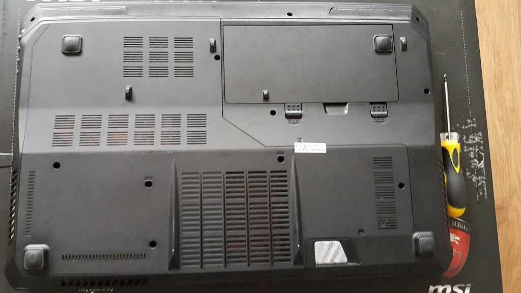 - Откройте заднюю крышку ноутбука. Если не знаете, как снять заднюю крышку ноутбука, то посмотрите инструкцию в интернете конкретно под модель. Однако большинство крышек просто снимается после откручивание винтиков крестовой отверткой.