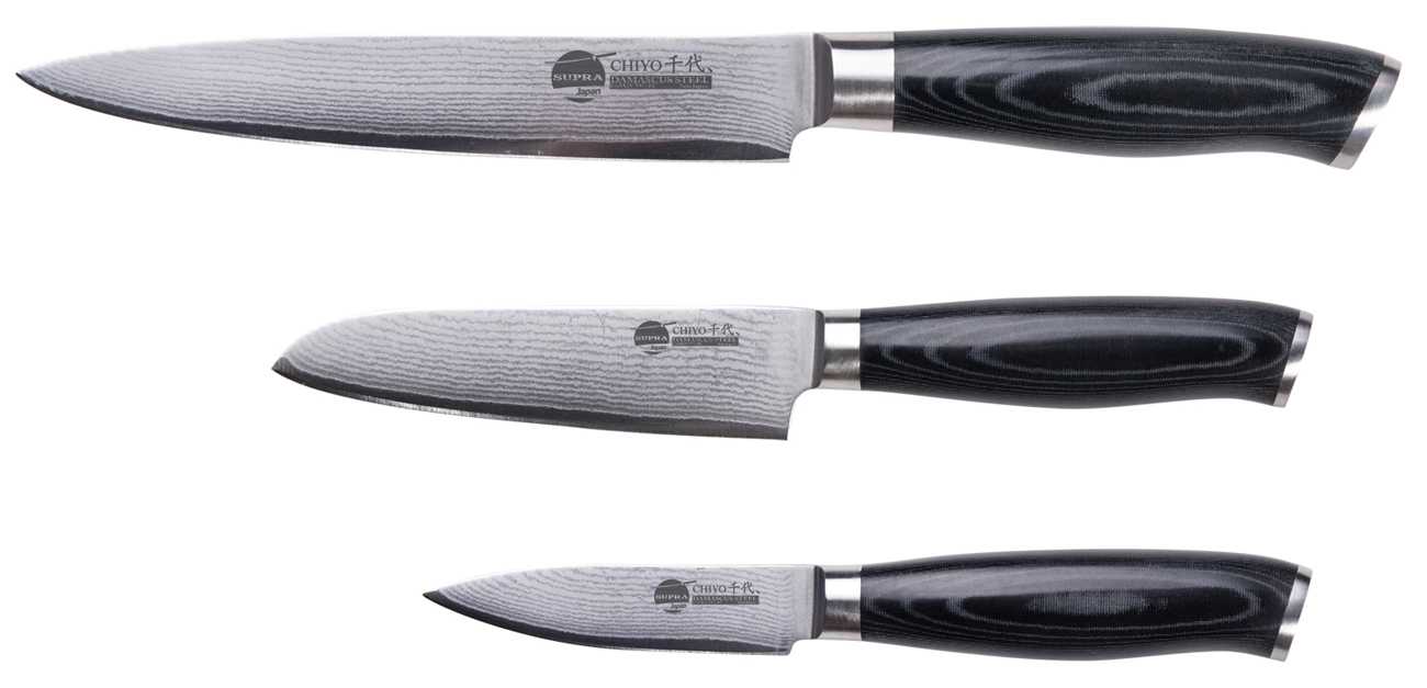 «Кухонное трио». Это три ножа простой удобной формы, с прямым лезвием средней ширины. Обычно их размеры (в длину) примерно такие: от 45 см (большой), около 35 см (средний) и порядка 25 см (малый). Они используются для разделки рыбы, овощей, колбас и любых других продуктов с плотной структурой. Они довольно универсальны и вполне могут удовлетворить обычные потребности. В частности, сыр, хлеб и мясо можно также нарезать ими. Но искусные кулинары все же предпочитают дополнить свой набор еще несколькими специальными ножами.