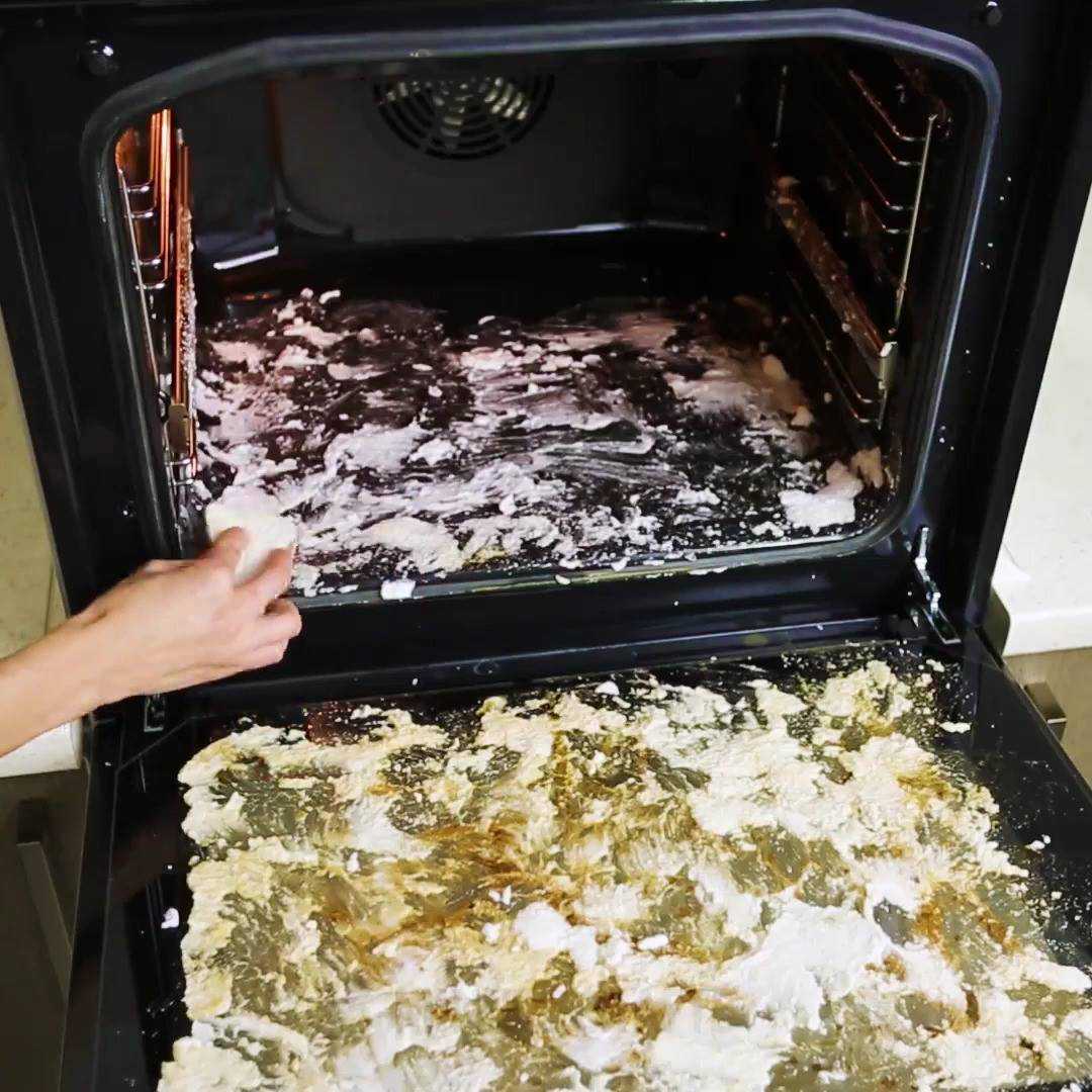 - При мытье духовки не следует забывать про дверцу. Ее внутреннюю часть моют тем же составом, что и весь духовой шкаф.