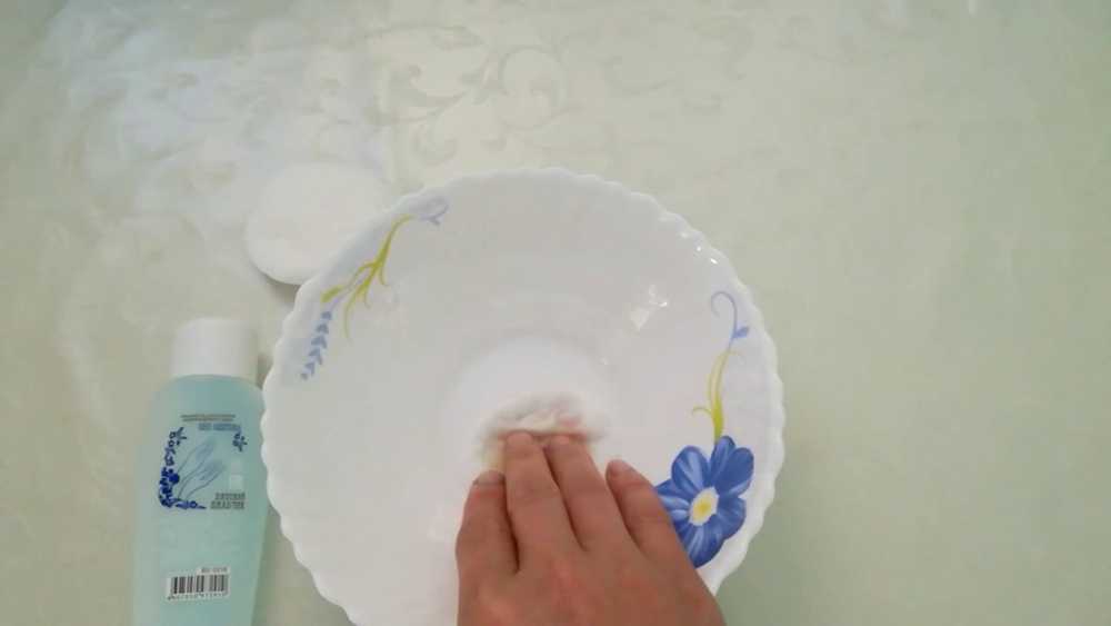 Обычно бывает в доме. Если нет, то продается в аптеке: подойдет любой спирт. Его можно заменить водкой или одеколоном. Наливаем немного на ватный диск, смачиваем и трем наклейку. Заодно избавляемся от следов клея.