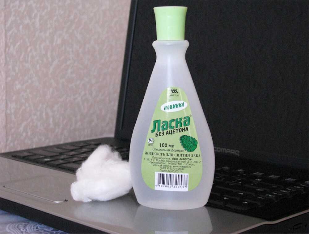 Лучше взять без ацетона: он может повредить пластик. Наносим с помощью ватного диска на этикетку. Оставляем на 3–5 минут, чтобы подействовало, и очищаем поверхность.