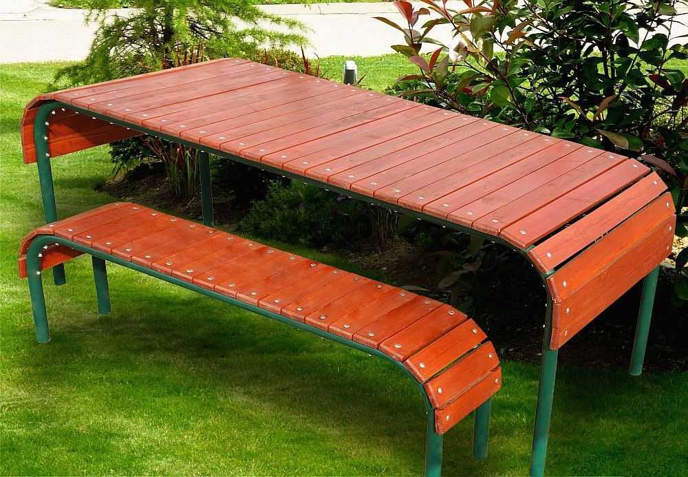 Не устаревающая классика – гарнитур из столика, скамейки и пары стульев. Завтрак на природе при наличии такого комплекта будет способствовать поднятию настроения на весь день.