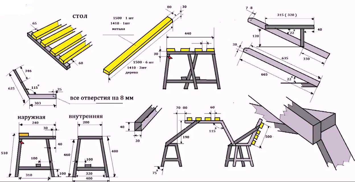 Соединение деревянных деталей выполняют с помощью саморезов и металлического уголка. Отверстия для саморезов желательно просверлить заранее, чтобы работа выглядела аккуратней. Самая большая нагрузка при сборке-разборке ложится на подвижные узлы.