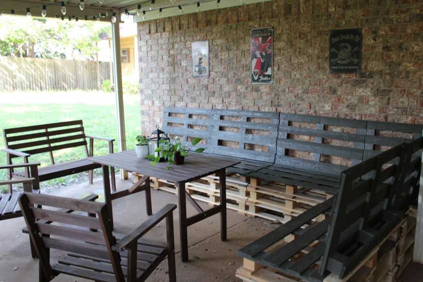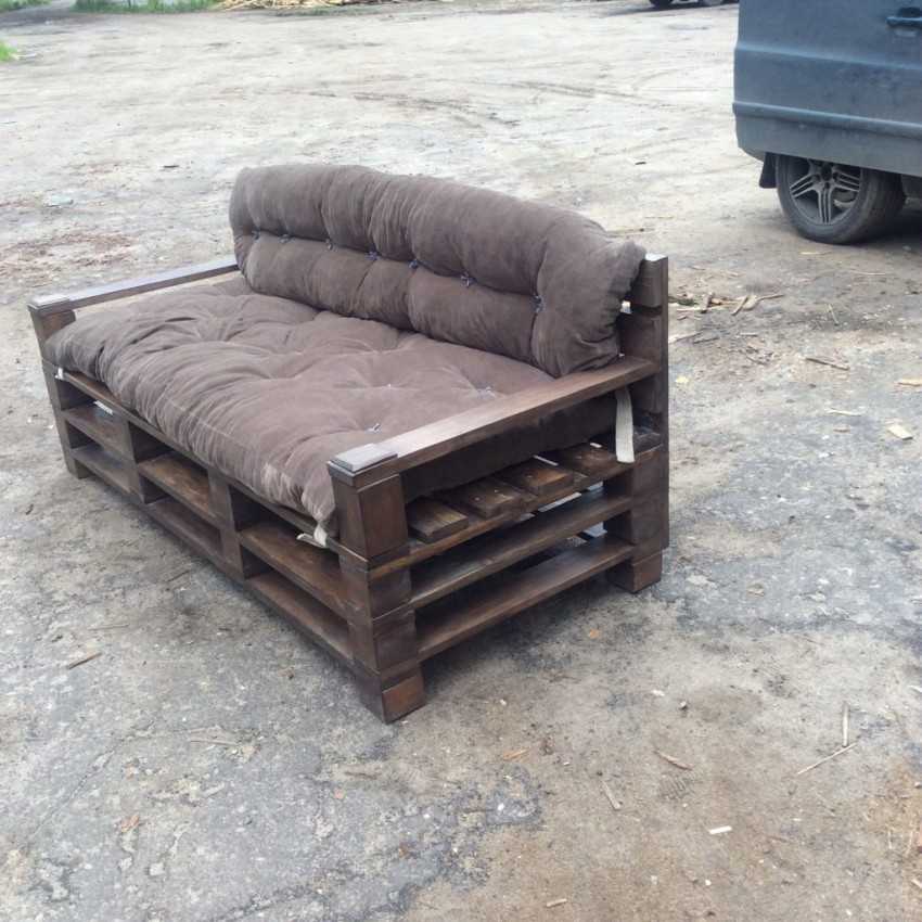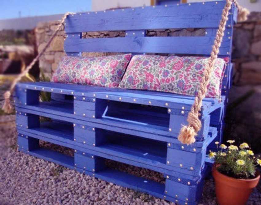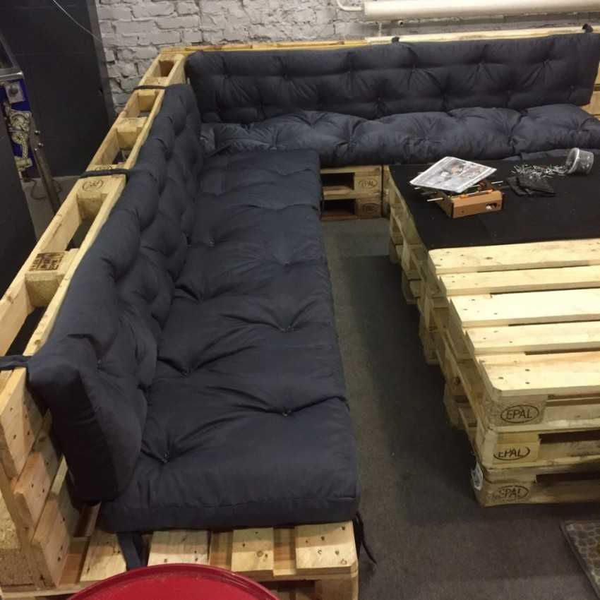 Такое кресло для дачи, сделанное своими руками, выглядит не хуже магазинных аналогов. Для комфортного использования сидений из паллет необходимо сшить на них подушки. Ткань выбирается исходя из условий эксплуатации мебели. В качестве наполнителя можно использовать поролон, холлофайбер, синтепон, шарики пенополистирола.