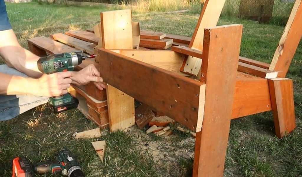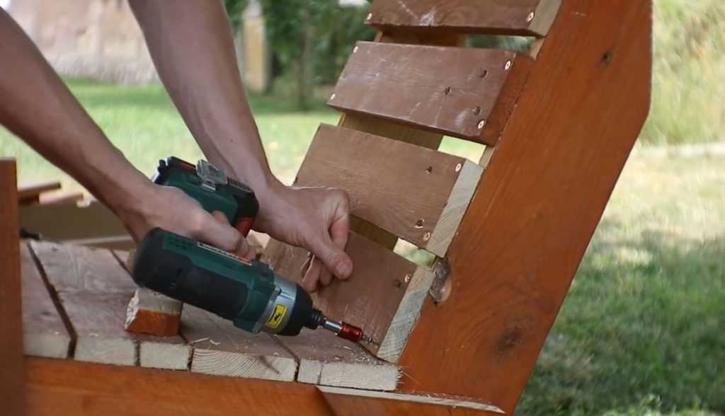 - Из элементов нужно собрать каркасное кресло из досок нужной формы, после чего закрепить элементы саморезами и шуруповертом.