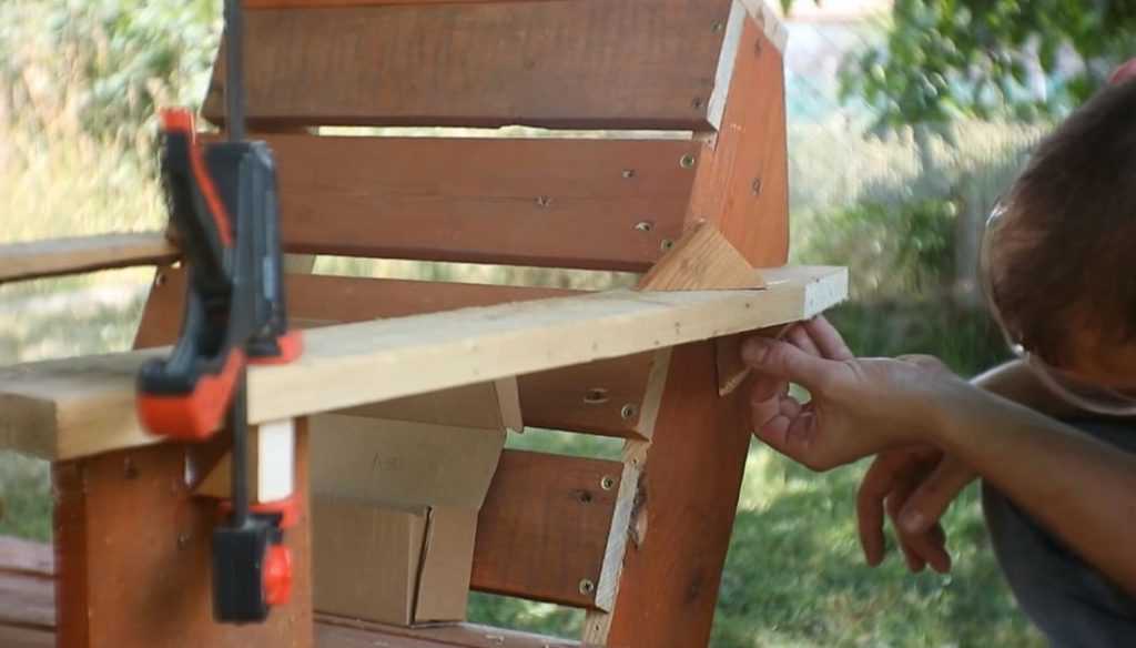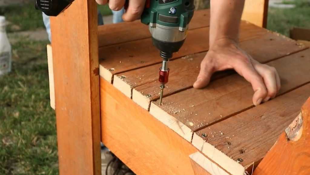 Шаг восьмой: далее необходимо взять бруски, которые мы заготавливали ранее, и поочередно присоединять к сидению на саморезы.