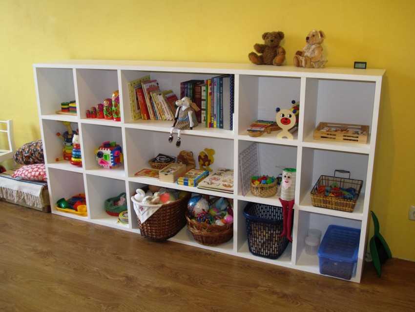 Аналог стеллажам небольшого размера. Несложно соорудить своими руками. Идеально подходят деткам раннего возраста. Малыш сможет самостоятельно брать, ставить игрушки, приучится наводить порядок. Иногда устанавливают всевозможные контейнеры, коробочки. Получается целая система хранения.