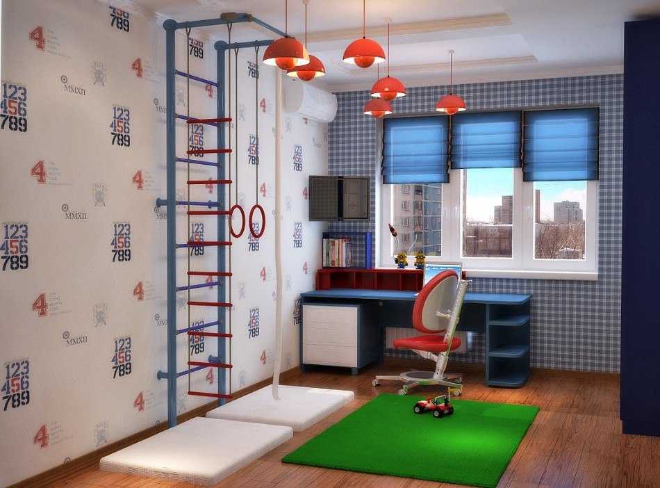 - спорта. В зависимости от возраста и пола детей в детской можно сделать небольшой спортивный уголок. Здесь размещается шведская стенка, веревочная лестница, турник.