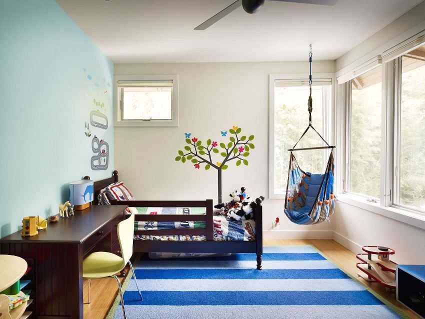 Важно подобрать соответствующие цвета: для мальчиков и девочек, благоприятные для отдыха и учебы. Базовая отделка должна быть приятного, пастельного оттенка, игровая зона самой яркой
