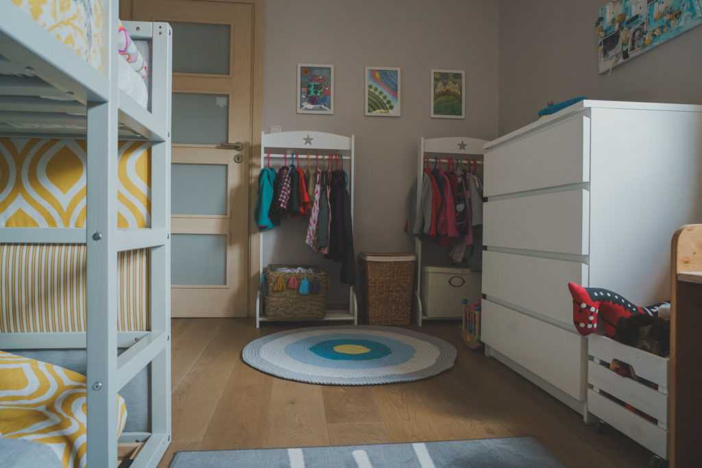 Если ваши дети разного пола, общий гардероб можно заменить на два шкафа, установив их в противоположных углах комнаты.