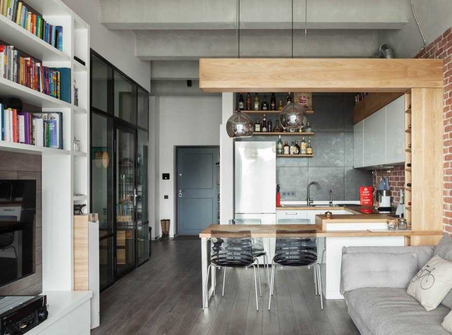 - Используйте в качестве зонирования не стены, а тонкие перегородки или же функциональную мебель. Например, барная стойка станет разграничителем кухни и столовой зоны. А стеллаж или диван поделит комнату на гостиную и спальню.