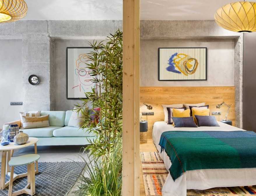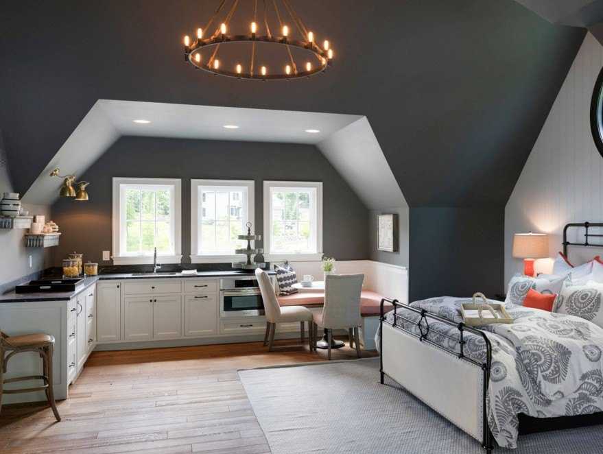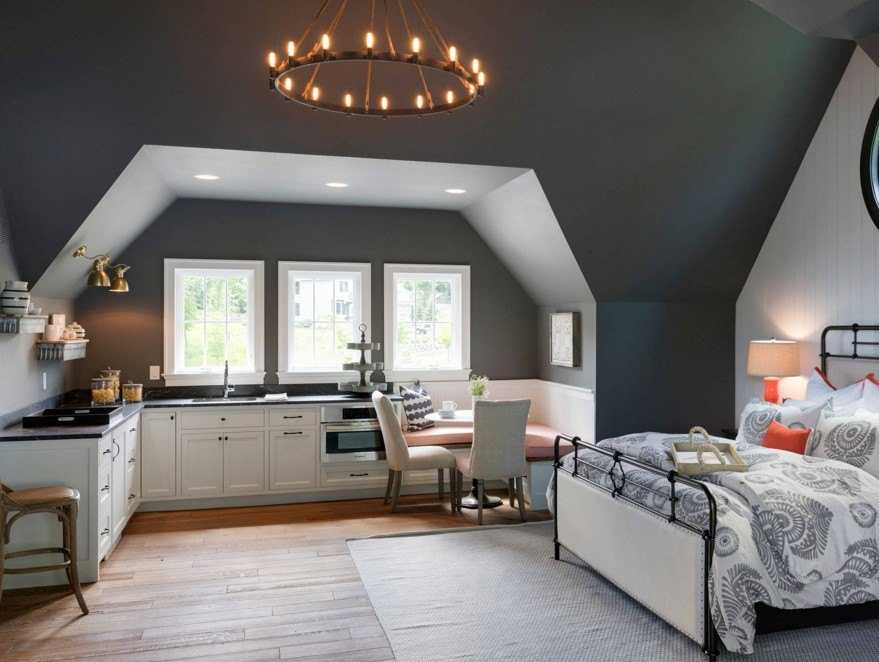 Универсальным можно считать выбор пастельных, светлых тонов. Яркими акцентами стоит выделять отдельные функциональные зоны. Этого можно добиться, окрасив часть стены, или добавив цветной текстиль. Но не стоит забывать, что обилие пледов, декоративных подушек может перегрузить интерьер.