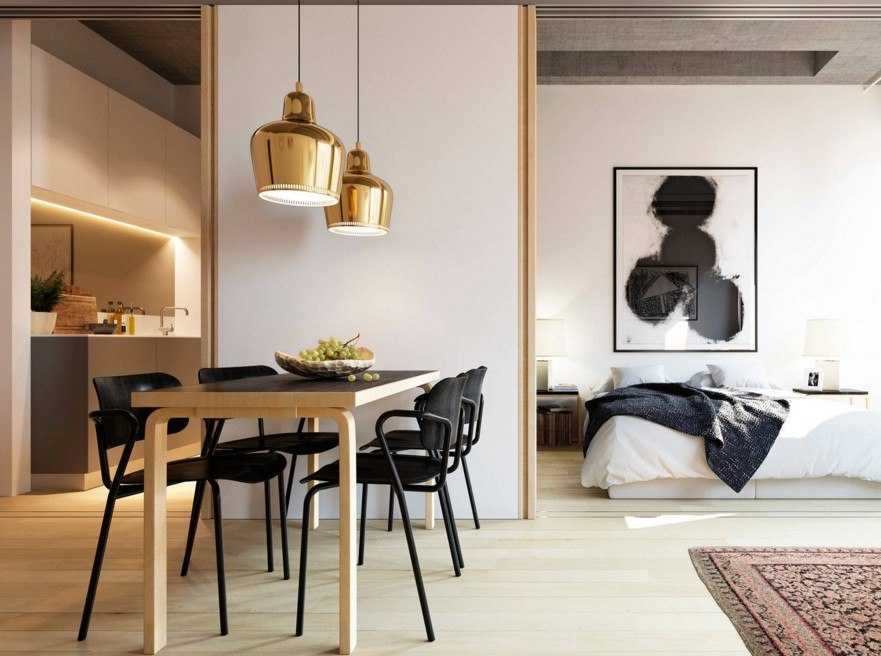 В однокомнатной квартире выделяют рабочий кабинет, спальное место, а возможно и столовую. Кухню рекомендуется разделить на две зоны – для готовки еды и для ее приема.