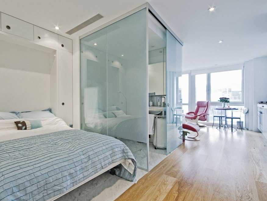 Разделить комнату можно с помощью стеклянной перегородки, занимающей минимум места и не затеняющей помещение