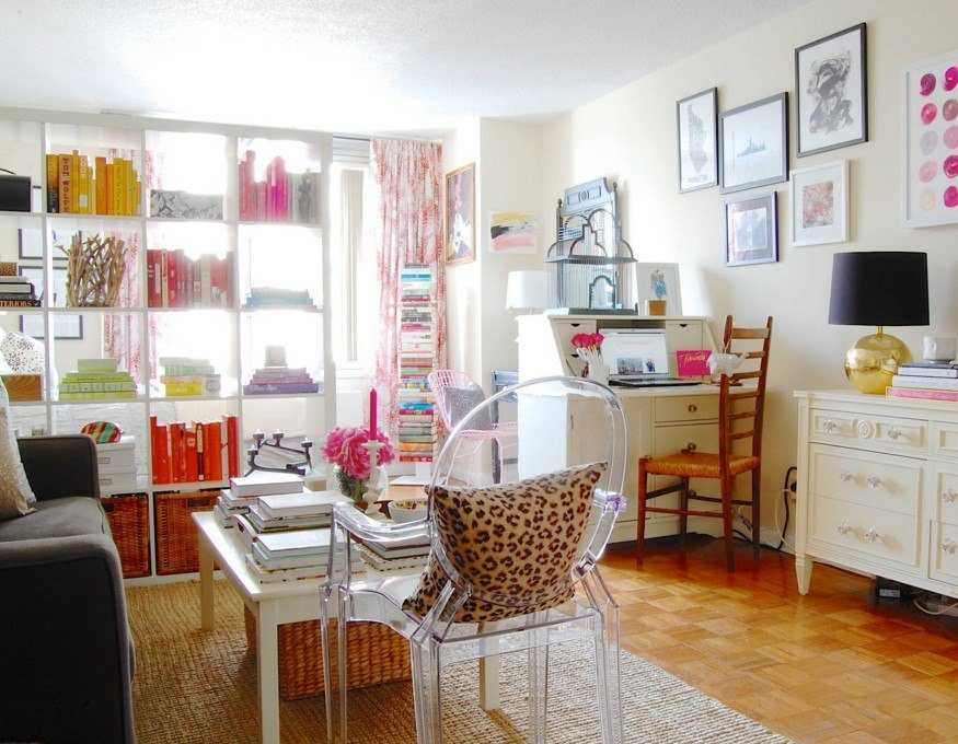5. Обычная мебель. Для стильного дизайна на границе двух зон ставятся шкафы с обычными или сквозными полками.