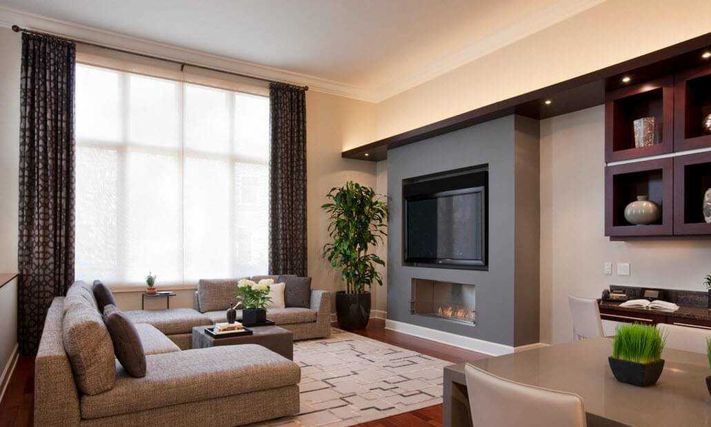 Если на одной торцевой стене находится окно, на противоположной ей стене можно встроить шкаф купе, который визуально сократит длину комнаты. Если помещение узкое и, к тому же, его площадь меньше 18 метров, не стоит использовать большое количество корпусной мебели. Так, вместо привычной «стенки» можно установить тумбу под ТВ напротив дивана и подвесить несколько узких полочек. Такая гостиная должна быть оборудована минимальным количеством предметов мебели с наибольшей функциональностью.