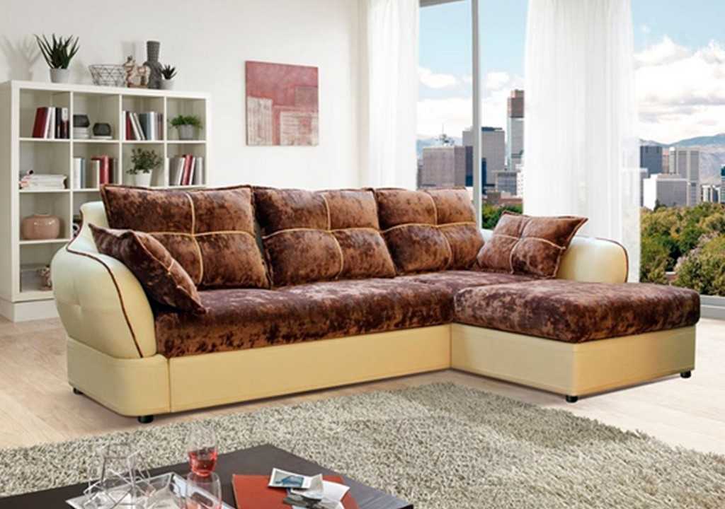 Живые Диваны Люкс. Угловой диван с оттоманкой. Имеет металлический каркас с независимым пружинным блоком и покрытием из полиуретана. Обивка из велюра. Имеет широкие подлокотники с деревянными термостойкими накладками, на которые можно ставить горячие чашки. В комплекте к дивану прилагается две съемные декоративные подушечки. Оттоманка стационарная, а центральная часть – выдвижная. Она состоит из трех секций. Оснащен бельевым коробом.
