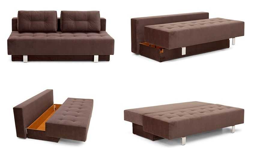| Книжка | За трансформацию отвечают два каркаса с зафиксированными пружинными блоками, вместо которых может использоваться мягкий наполнитель. | Спинка легко откидывается, внизу можно поместить ящик для хранения постельных принадлежностей. Однако такой диван сложно разложить, если в комнате мало места. |