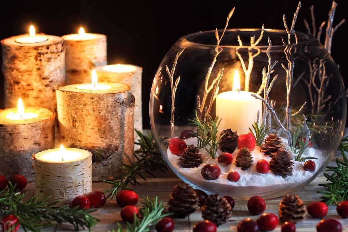 С помощью красивых свечей можно создать эффектный новогодний декор своими руками, фото которого представлено ниже. Это могут быть целые композиции из шишек, веточек, искусственного снега, мишуры и других мелких деталей.