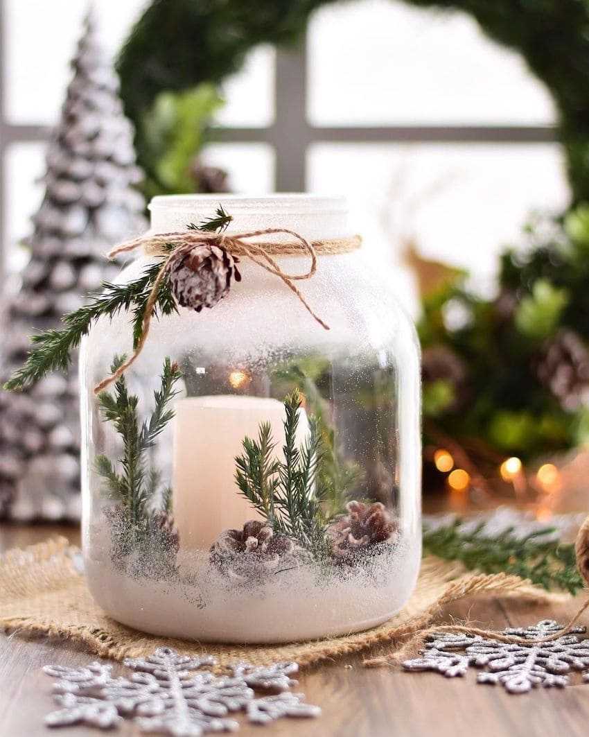 Для следующей идеи вам понадобятся стеклянные емкости и длинные свечи. Поставьте новогоднюю свечу в их горлышко, а свободное место, которое образуется на их стыке, украсьте тканью или хвоей.