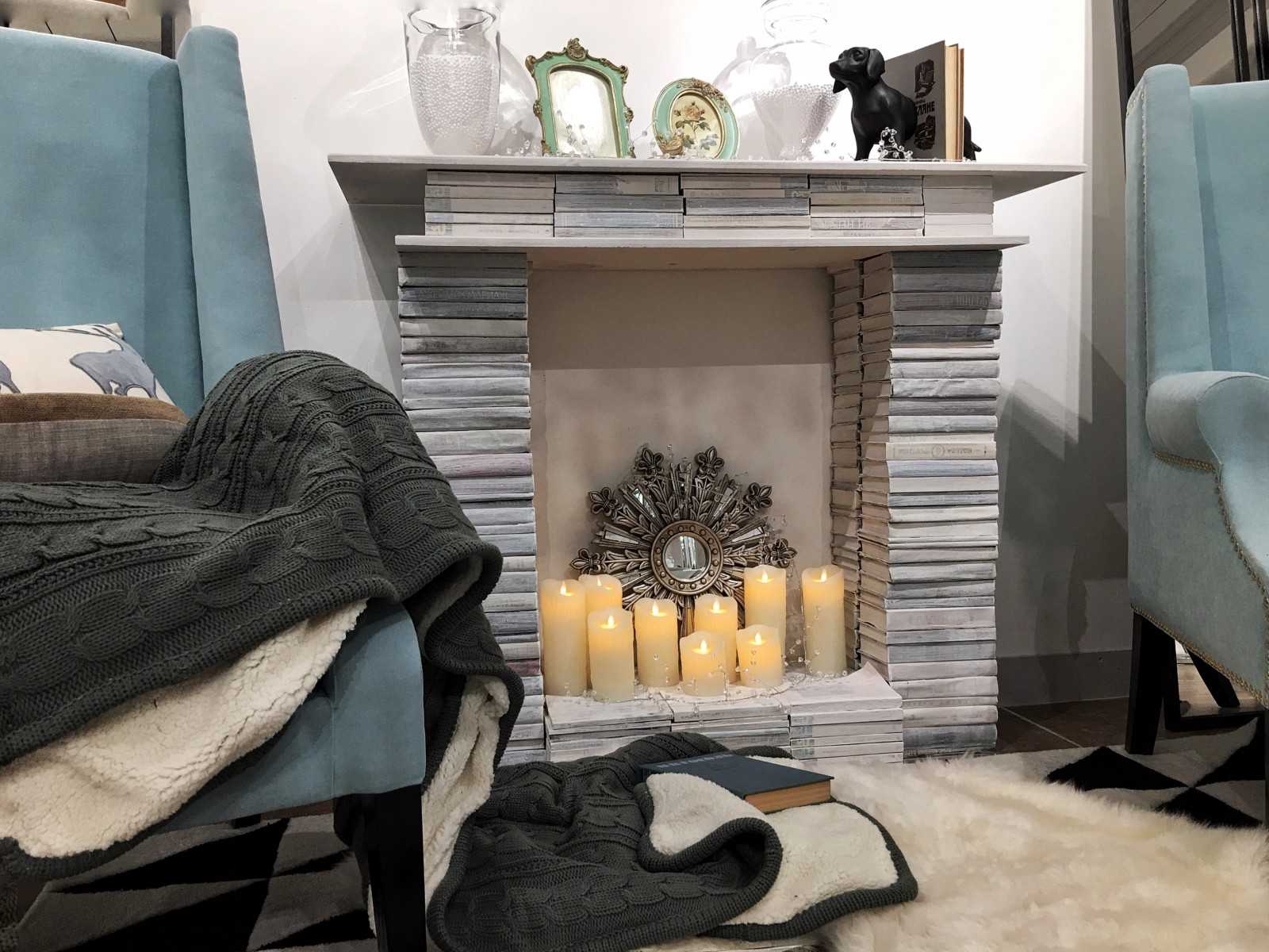 Устроить камин-муляж можно и с использованием книг. Обычно используются толстые, в твердых переплетах. Из них выполняются боковые стойки – книги просто кладут друг на друга, верхней полкой станет узкая доска. Внутренняя часть оформляется рисунком костра, большой его фотографией. В самом портале так же складируются печатные издания.