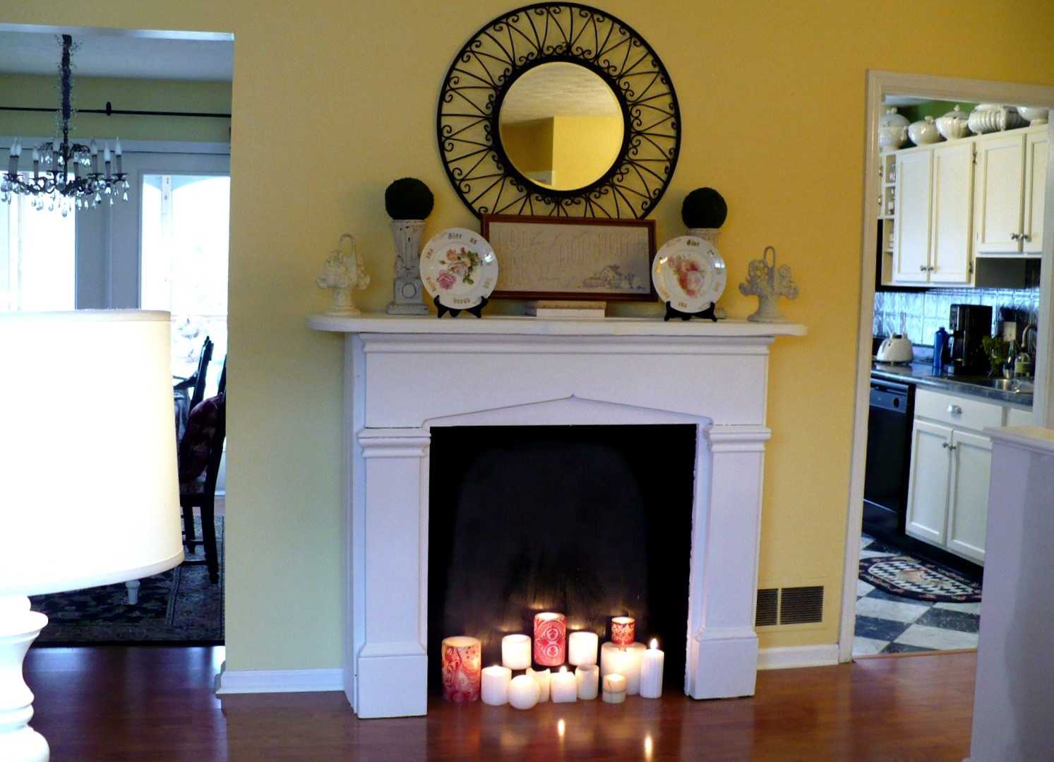 - Поставить внутрь камина свечи в стеклянных стаканах-подсвечниках. Этого делать нельзя, если топка низкая и есть риск возгорания. Будьте предельно осторожны и соблюдайте правила техники безопасности!