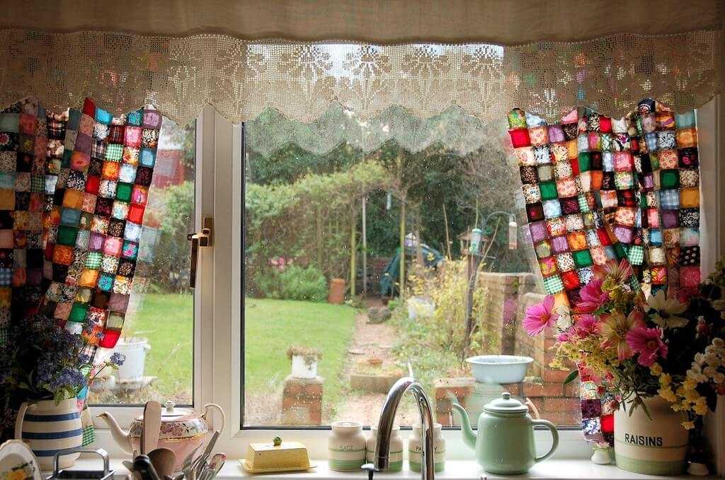 Еще для кухни можно сшить оригинальные шторы для окон из лоскутов. Получатся оригинальные занавеси в стиле пэчворк.