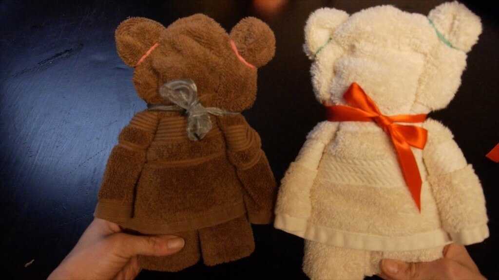 Для украшения кухни или ванной комнаты пригодится симпатичный мишка. Он легко сворачивается из полотенца.