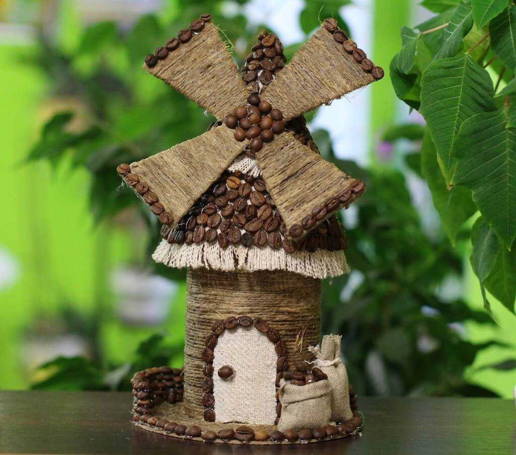 На кухню можно сделать домик или мельницу из бутылки. Для этого еще понадобятся бечевка, кофейные зерна, кусочек льна или мешковины, картон, клей.