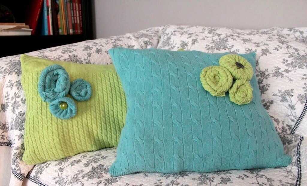 Взгляните на эти диванные подушки. Правда, стильные и уютные наволочки получились из кофт? Так и хочется присесть или прилечь отдохнуть.