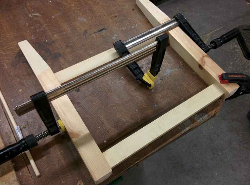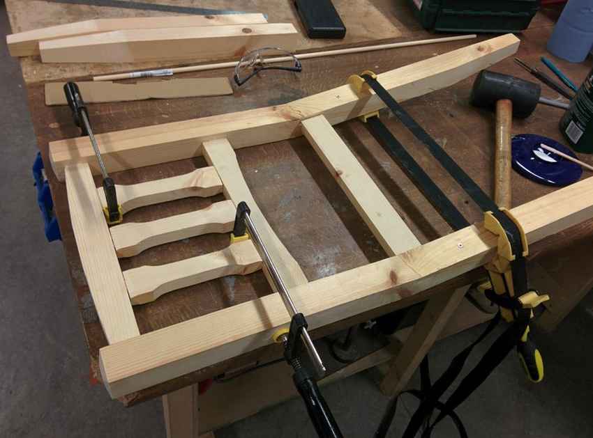 - Теперь собираем все готовые элементы вместе: приклеиваем к задним ножкам перемычки, фиксируем детали струбцинами и вкручиваем шурупы.