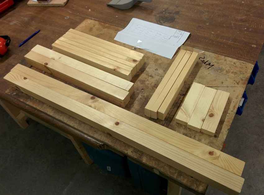 - Дерево раскраивают для получения пары проножек, поперечных реек, 4 царг. Из фанеры выпиливают сиденье.