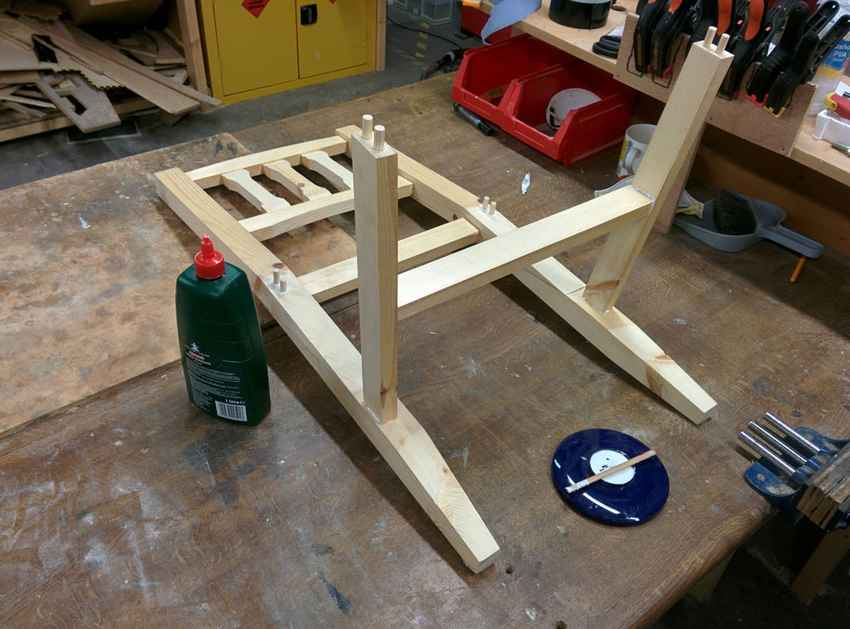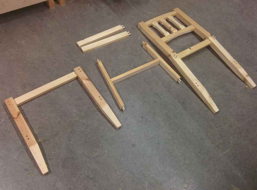 - После полного высыхания деталей прикручивают проножки, закрепляют рейки, монтируют сиденье.