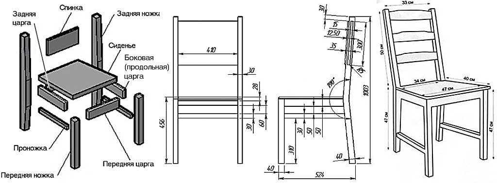 Самый простой вариант для мастера — выбрать готовый чертеж с подробным описанием каждого элемента стула. Оптимальные размеры мебели рассчитаны на средний рост мужчин (170–175 см) и женщин (160–165 см). В соответствии с этими параметрами рассчитывают идеальные показатели каждого элемента: