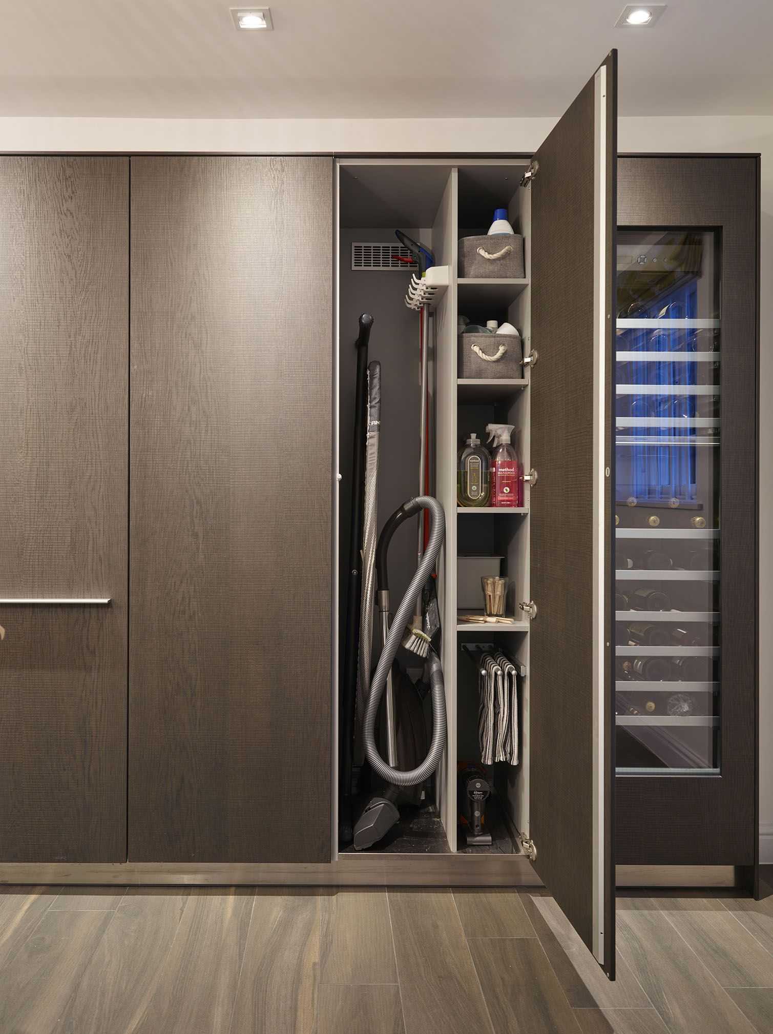 С момента определения с наполнением шкаф разделяют на отдельные зоны, используя при этом перегородки. Классический подход наполнения отдает главную роль гардеробной части. Тут размещается полки, штанга и вешалки. Далее место рассчитано для хозяйственных предметов: швабра, веник, пылесос, гладильная доска и прочие средства для наведения порядка в доме.