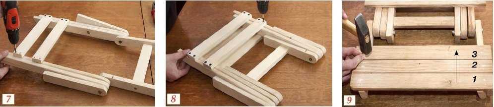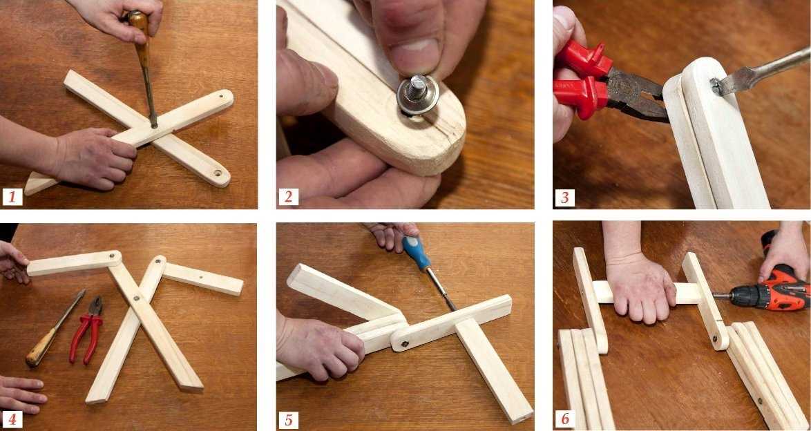 Деревянный складной стул начинают мастерить с сиденья. Рейки прикрепляют к брускам каркаса саморезами. Затем приступают к конструированию опоры. Собирают одну часть, состоящую из двух ножек и спинки, и затем другую, заднюю. Сверху к передним прибивают рейки для спинки, а снизу – поперечину. К задним опорам крепят нижнюю, а также верхнюю перекладину. Получаются две рамы, которые соединяются при помощи крепежной фурнитуры. Последующая задача – прикрепить сиденье раскладного стула. В нем, как и в опорах, делаются сквозные отверстия для болтов.