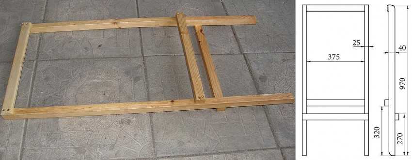 Вырезаются из обрезной доски планки спинки длиной 42 см, количество и ширина могут варьироваться. На концах планок тоже делают шипы, а с внутренней стороны задних ножек (опор спинки) выбирают пазы соответствующего размера.