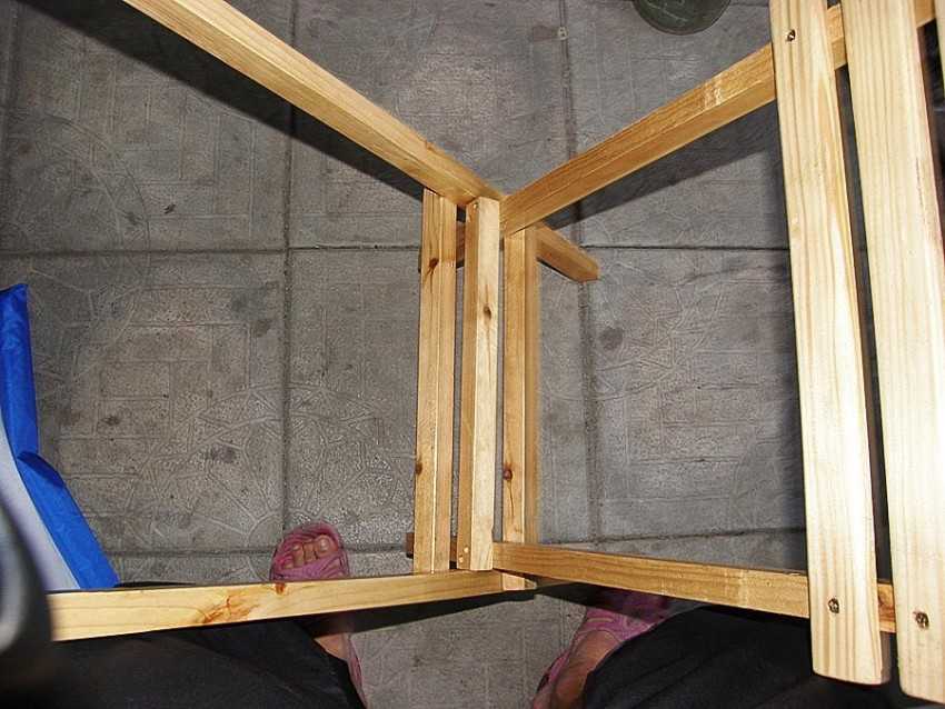 Ровно отрезаем верхушку ножек и соединяем бруски. Они должны находиться перпендикулярно по отношению к полу. Чтобы не запутаться, на внутренних углах рекомендуется делать пометки.