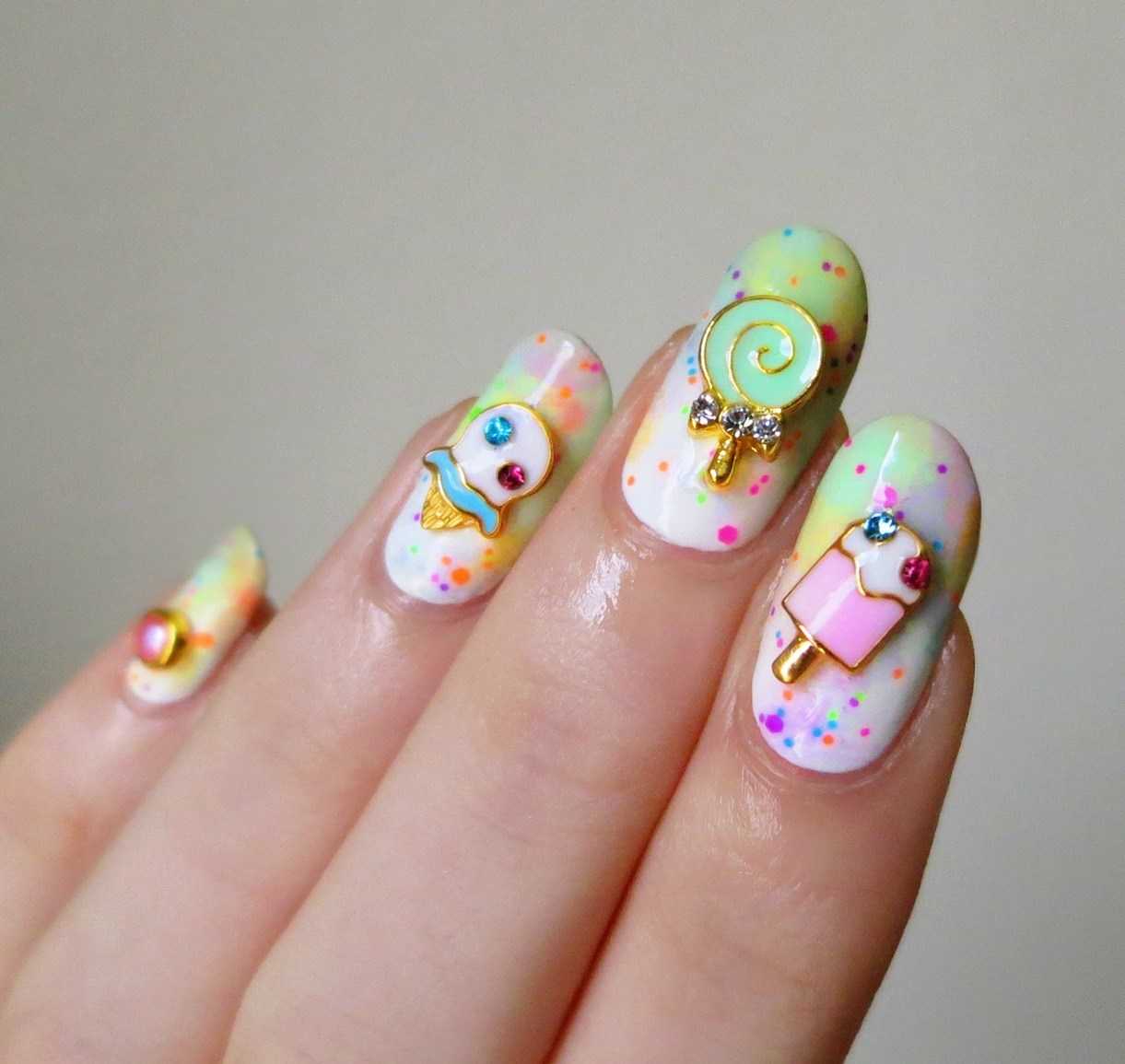 Любительницам сладостей позволено «увековечивать» свои привычки в маникюре при помощи нарисованных пончиков, рожков с мороженым и стаканчиков с коктейлями.