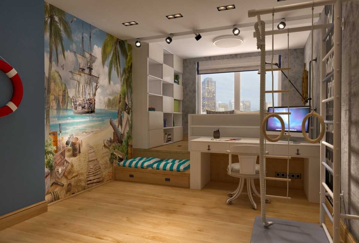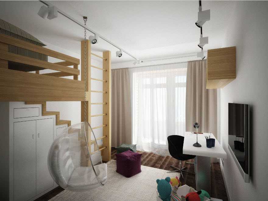 В центре комнаты — спортивный уголок — необходимый элемент детской для правильного физического развития ребенка.