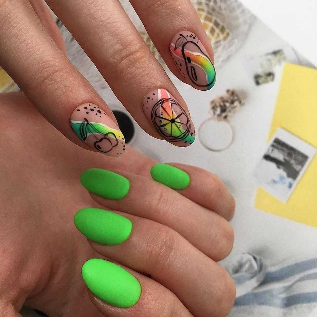 Нейл-дизайнеры советуют не сдерживать полёта фантазии при выборе цветовой палитры, и смело создавать самые оригинальные задумки. В зависимости от периода цветений, юные барышни могут украшать маникюр изображениями на флористическую тематику, например, одуванчиками или ромашками. Также очень круто смотрятся в это время года сочные дольки апельсинов, клубнички или вишенки.
