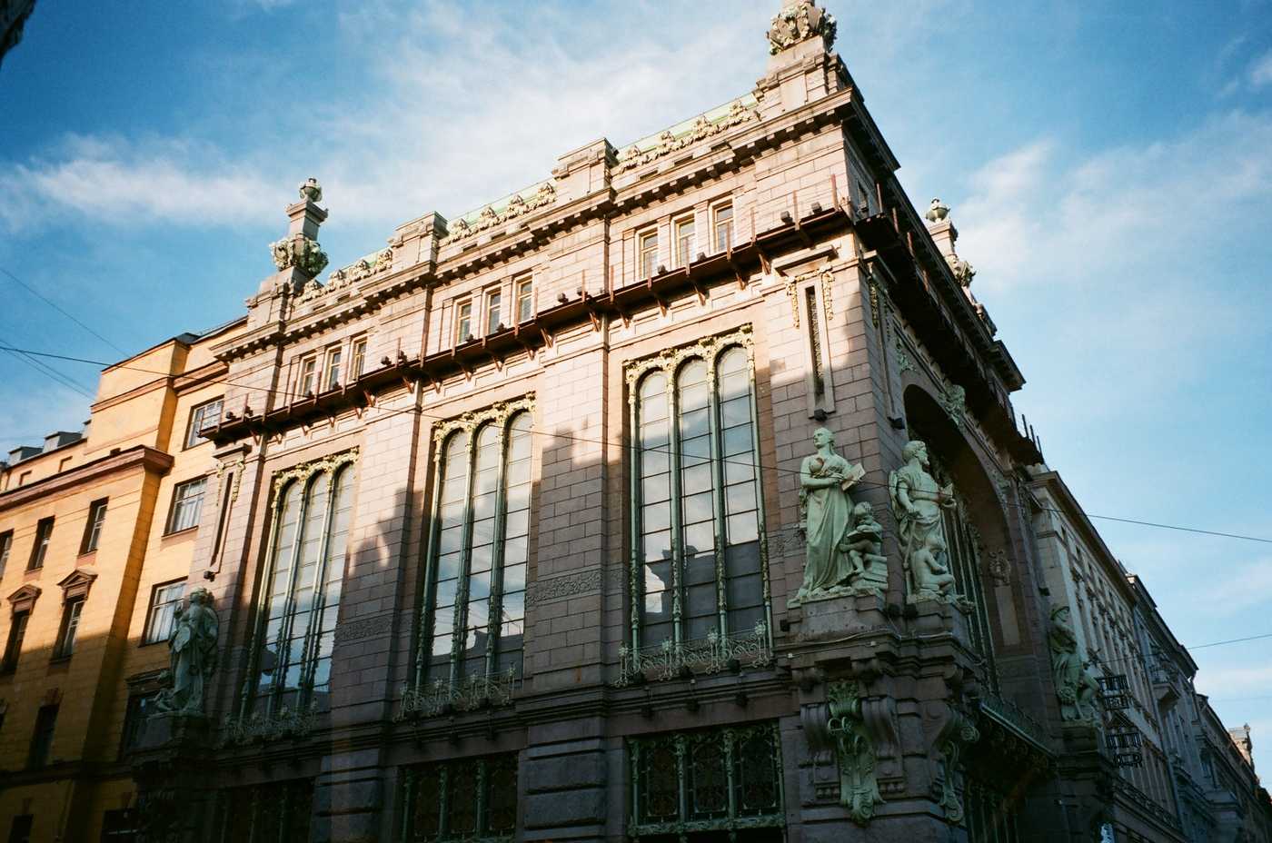 Помимо пышных особняков в Петербурге стали появляться дома в более сдержанном и скандинавском подвиде стиля — северном модерне или национальном романтизме. Для него характерно использование натуральных материалов, необработанного камня и фольклорных сюжетов в декоре. Более суровые на первый взгляд дома часто напоминают замки, но их неприступный вид сочетается с изяществом модерна, яркими декоративными деталями, выраженными через витражи, мозаику и майолику. О северном модерне есть отдельный подробный пост.
