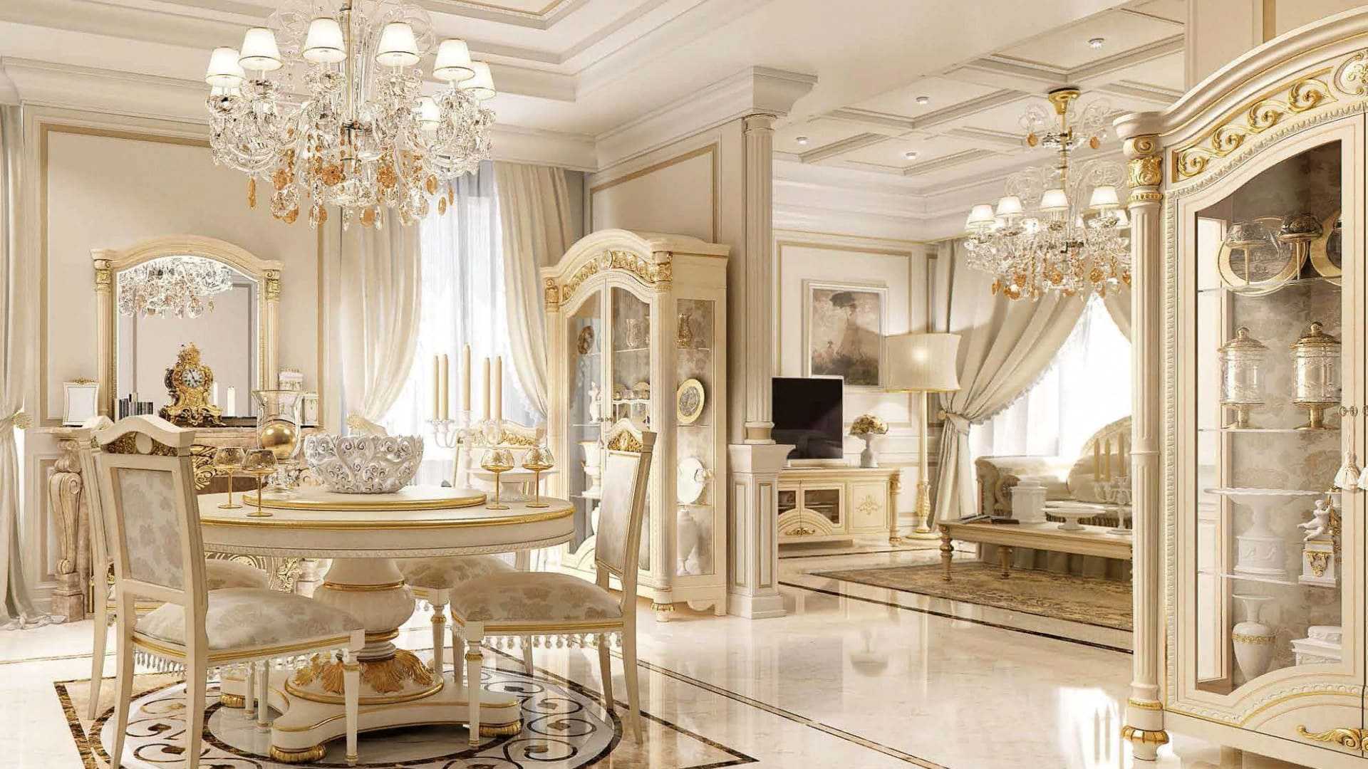 Даже самый удачный гарнитур и грамотно обставленная обеденная зона будут плохо смотреться без соответствующей отделки. Барокко — это один из немногих стилей, у которого имеются весьма строгие требования к отделке, где нельзя искать компромиссы.