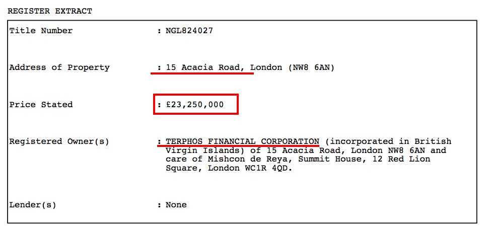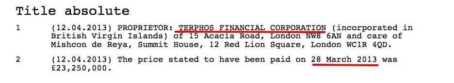 Согласно официальной кадастровой выписке на этот адрес, особняк был куплен фирмой Якунина 28 марта 2013 года за £23.3 миллиона фунтов.