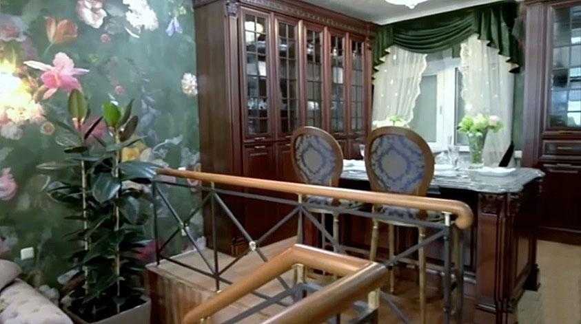 На второй этаж ведет лестница из темного дерева, украшенная фигурой льва (ниже в фотогалерее).Там располагаются просторная столовая и кабинет мужа Гузеевой. В столовой – дубовые массивные стол и стулья.