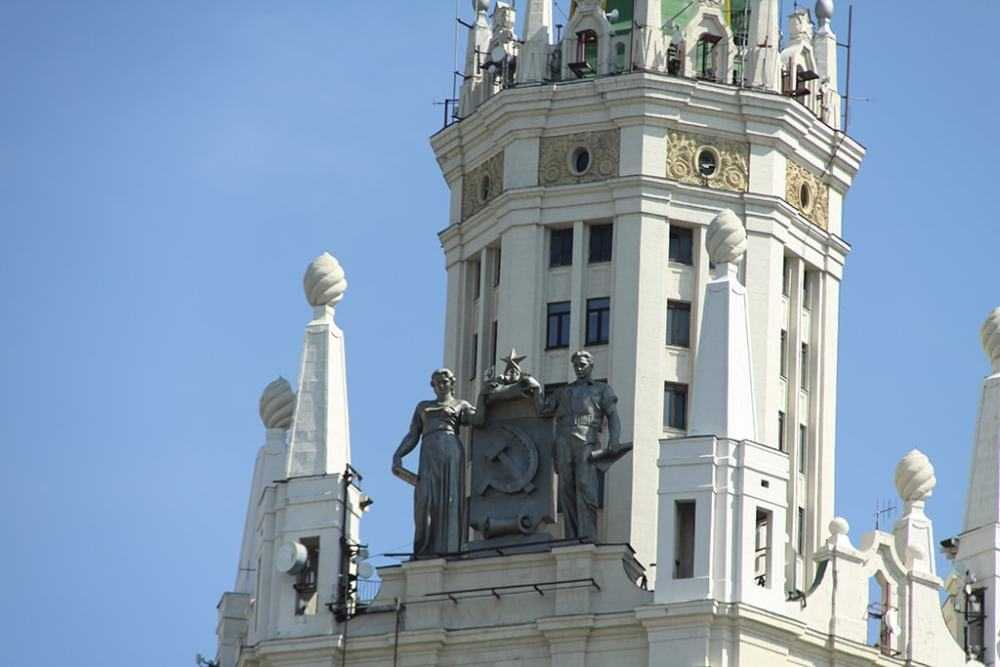 Есть у этой высотки и одна забавная деталь. На крыше перед последней башенкой здания установлена скульптура мужчины и женщины, разворачивающих свиток с советским гербом.