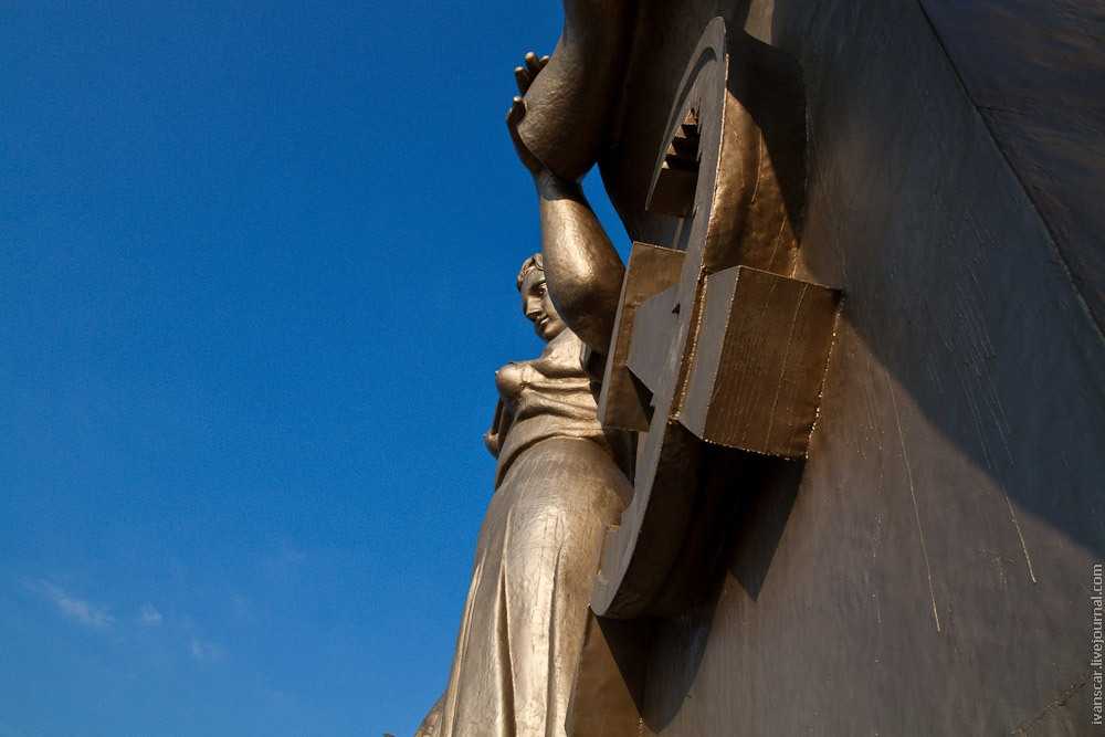Если присмотреться к женской фигуре, то обнаружится, что авторы обошлись с патриотическим материалом крайне фривольно: обратите внимание на грудь комсомолки. Видимо, скульпторы рассчитывали, что на такой высоте этого никто не заметит